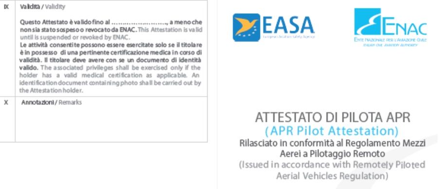 – L’Attestato di Pilota APR (Operazioni non critiche) è rilasciato a seguito del completamento di un corso online e del superamento di un esame online svolto su un portale web dedicato dell’ENAC.