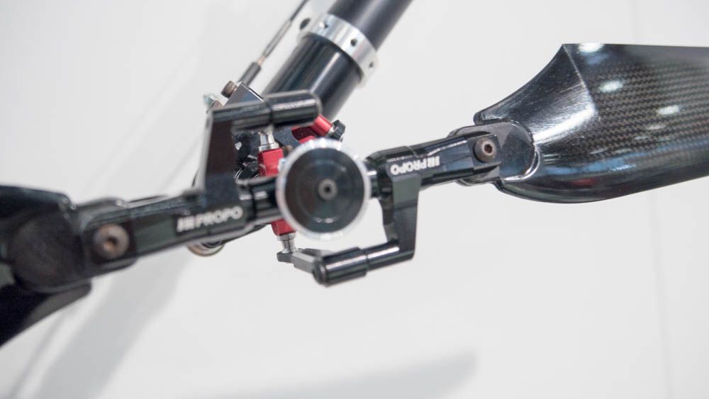 JR Propo, attiva da tempo nella produzione di radiocomandi e servi di altissimo livello nonchè elicotteri sia a scoppio che elettrici espone un quadricottero molto particolare con eliche a passo variabile: