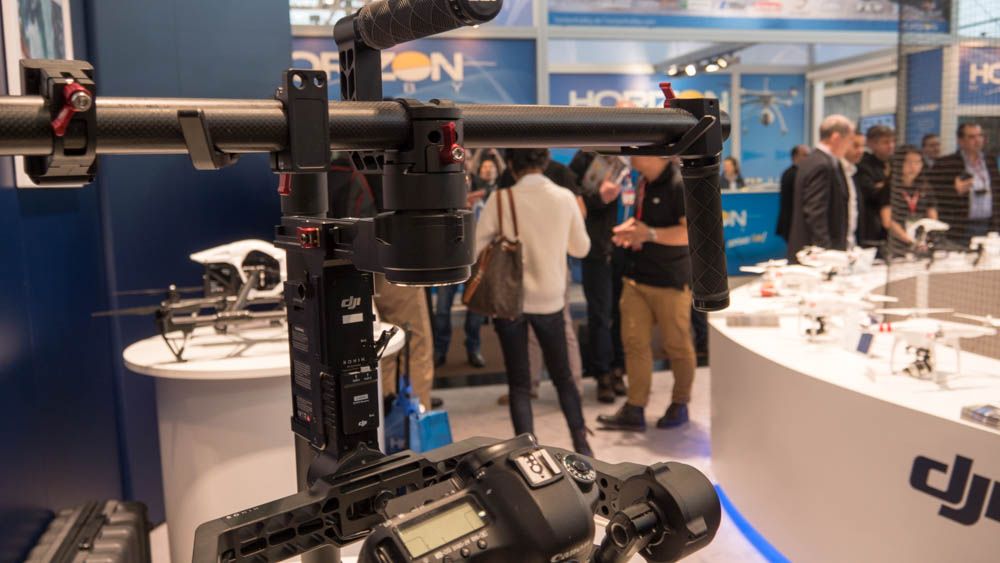 Una scena specifica è anche predisposta per il Ronin, il sistema di stabilizzazione “a mano” di elevatissimo livello e di particolare interesse perché autoadattativo a qualunque telecamera con qualunque lente vi si monti (e ci chiediamo: perché non fate TUTTI i gimbal così????). Visibile anche il nuovo joystick a pollice per utilizzo da parte di un singolo operatore.