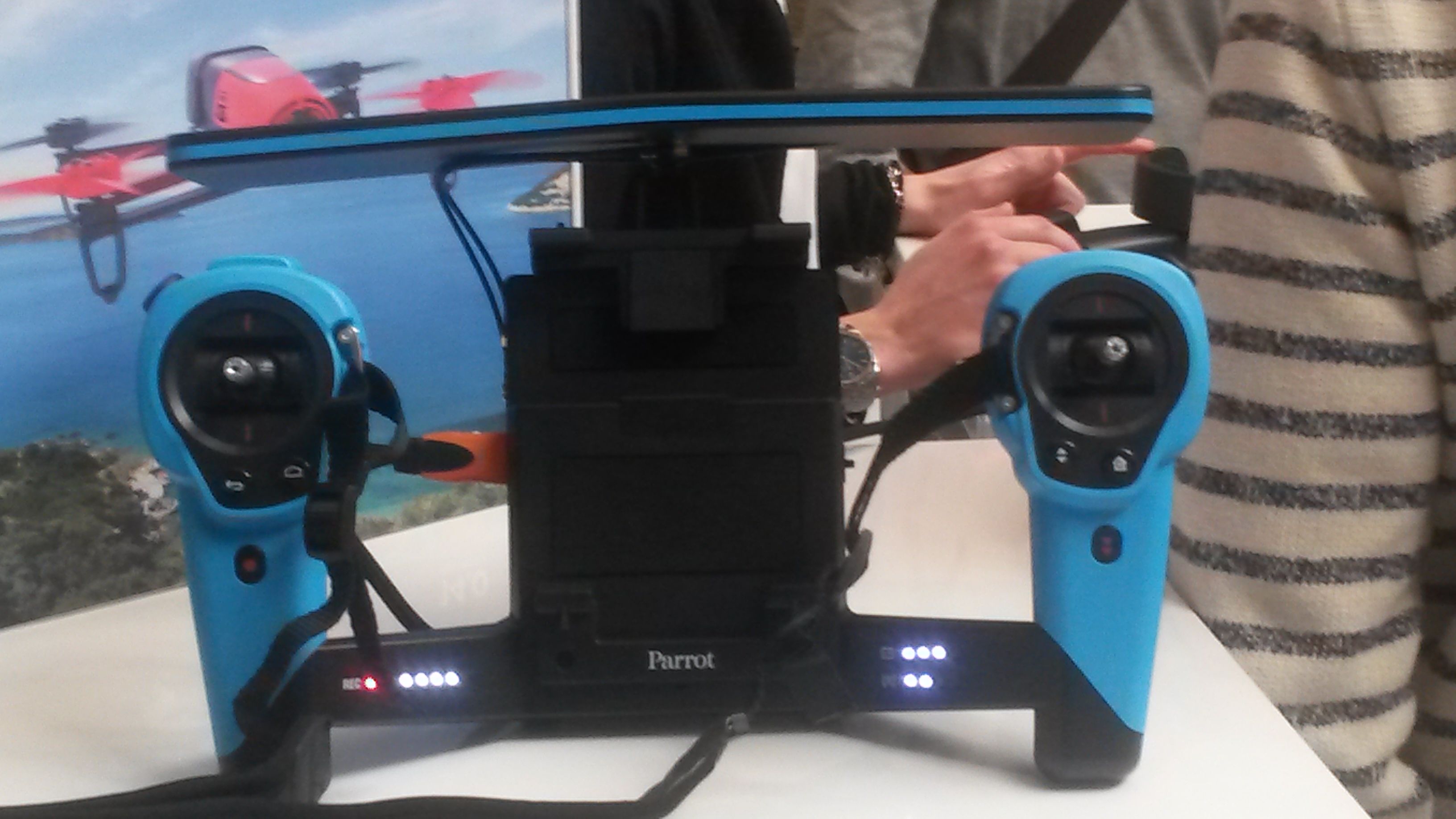 Finalmente, dopo avere visto il prototipo ancora piuttosto rozzo a Orlando, in Californa, riusciamno a metetre mano sullo  Skycontroller, il “dradiocomando” del bebop: è opzionale, nel senso che si può tranquillamente controllare il drone anche senza, usando semplicemente un tablet, ma lo SkyController oltre a essere infinitamente più comodo aumenta di parecchio il raggio d’azione del link WiFi, fino a un chilometro: poco rispetto al 2,4 GHz, ma adeguata per il piccolo quadricottero.