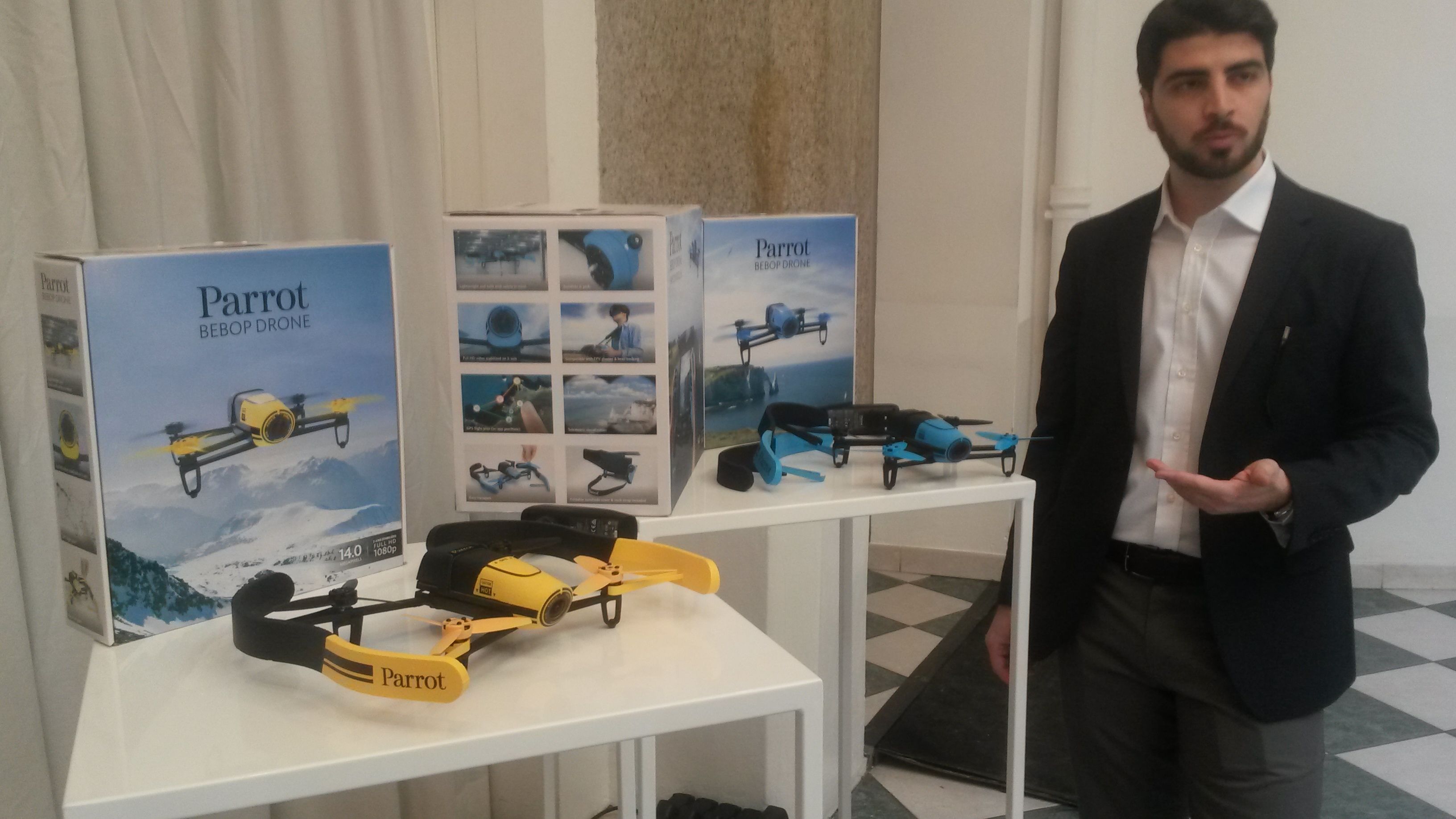 Abbiamo approfittato della presentazione per intervistare Giorgio Castellano, Country manager di Parrot per l’Italia, che ci rivela che nei piani di Parrot il Bebop resta una macchina destinata agli hobbysti, e al momento non ci sono piani per arrivare a una certificazione ENAC della macchina francese per le operazioni specializzate. Come per gli altri Parrot, il canale di vendita principale del Bebop saranno i centri commerciali, ma Castellano ci rivela che arriveranno anche nei negozi di modellismo, pur comn qualche resistenza da parte di alcumni venditori che bnon si trovano a loro agio con una macchina così particolare, che al posto del consueto 2.4 GHz usa come radio link principale il wifi. Ecco l’intervista con il manager italo francese: