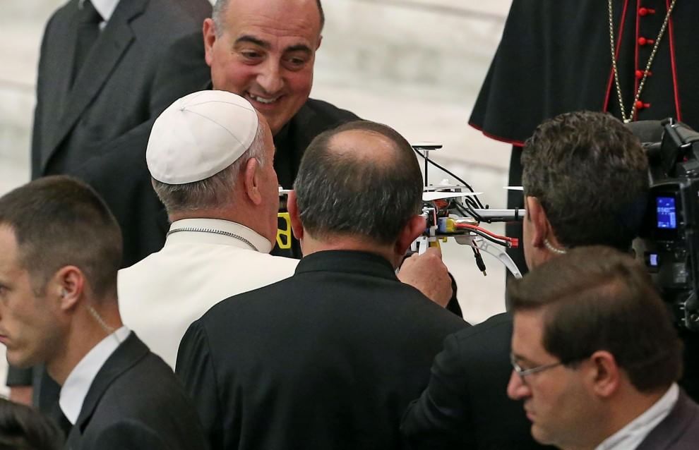 Un drone in dono al Papa: gli è stato consegnato questa mattina, al termine dell’udienza nell’aula Paolo VI, riservata alla Lega missionaria studenti con le comunità dei padri gesuiti e gli alunni e famiglie dell’istituto Massimo di Roma. Il drone, consegnato dal rettore dell’istituto padre Giovanni La Manna, è stato realizzato dagli alunni, che hanno un’età compresa tra gli 8 e i 17 anni, ed è stato dipinto con i colori del Vaticano e con lo stemma di papa Francesco. “Vuole rappresentare l’unione tra i valori della tecnologia posta al servizio dell’uomo – spiegano in una nota gli organizzatori – come ad esempio sta avvenendo proprio in questi giorni nell’ambito della tragedia che ha coinvolto i cittadini del Nepal e dove i droni si sono rivelati utilissimi per verificare le condizioni delle strutture dall’alto e studiare percorsi per portare i soccorsi alle persone che ne hanno bisogno anche in villaggi isolati”