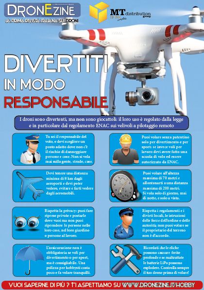 I droni sono in libera vendita, ma ci rendiamo conto che il prodotto va correttamente spiegato al consumatore” ha dichiarato Paolo Martelli, responsabile  commerciale di MT Distribtion. “Così con DronEzine, testata leader del settore, abbiamo studiato una campagna di sensibilizzazione all’uso consapevole e sicuro dei prodotti DJI“. Da oggi in tutte le scatole vendute nella GDS gli acquirenti troveranno una brochure, curata da DronEzine, sull’uso dei droni nel rispetto della legge e delle norme di sicurezza.