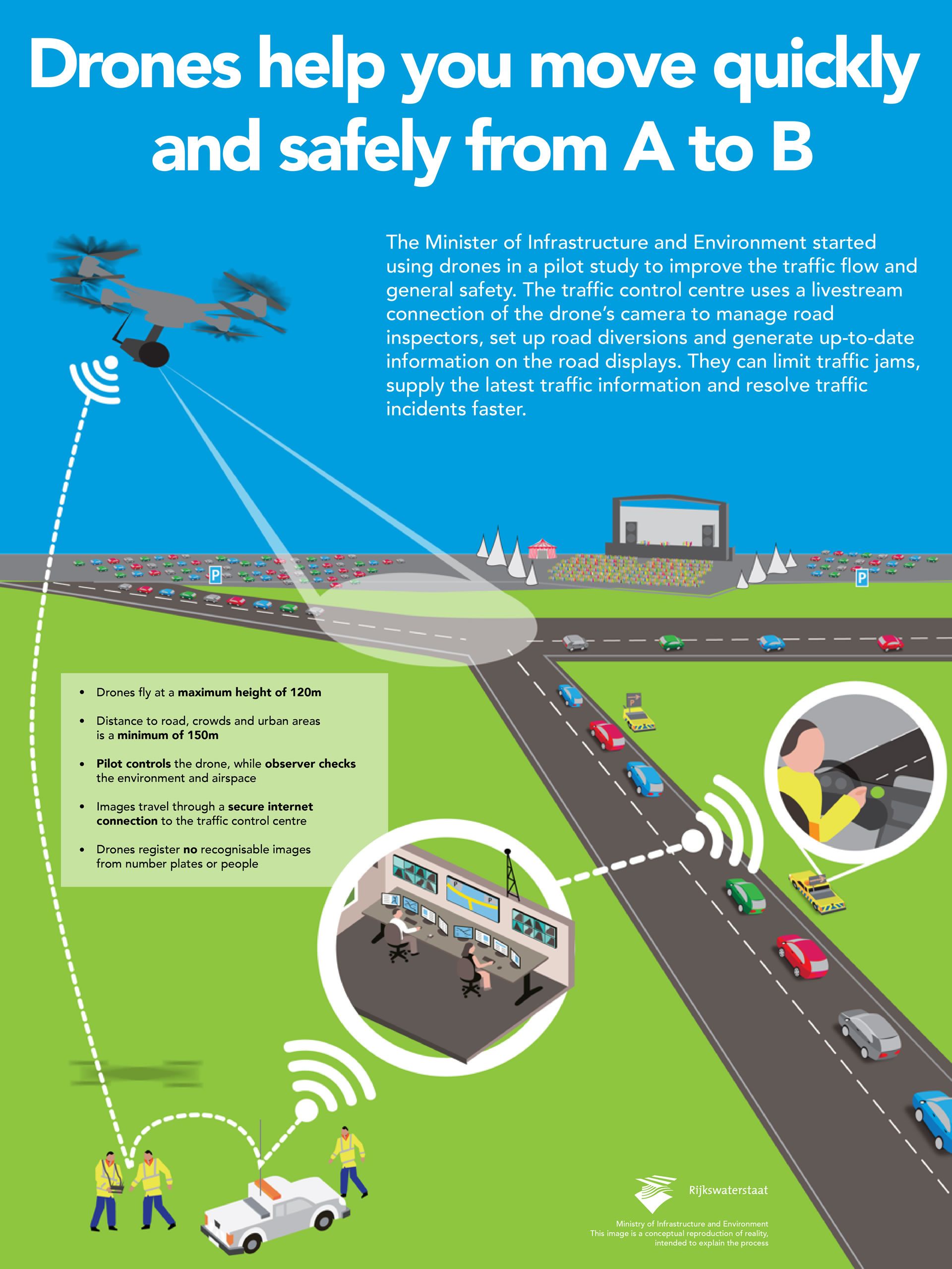 Gertske de Bruijn, del Ministero delle Infrastrutture e Ambiente, ha dichiarato: “Il valore aggiunto dei droni è enorme. Con le immagini in diretta che il drone ci ha inviato, si potrebbero limitare i disagi dovuti agli ingorghi deli traffico, di risolvere gli incidenti più velocemente e offrire agli automobilisti informazioni sul traffico in tempo reale.