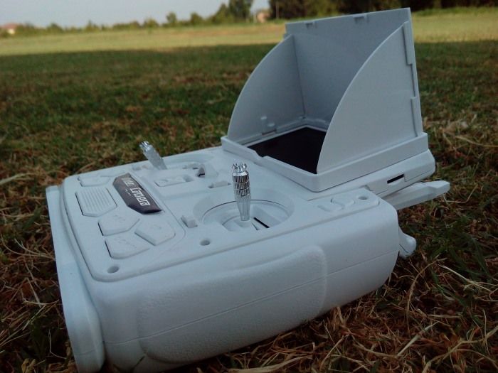 Accendere il radiocomando è semplice e si può fare muovendo la slitta centrale, Un altro bottone con la scritta Power si occupa di alimentare il sistema di ricezione FPV – First Person View – con relativo monitor incorporato. Display LCD che dispone anche di una protezione plastica che aperta funge anche da piccolo parasole.
