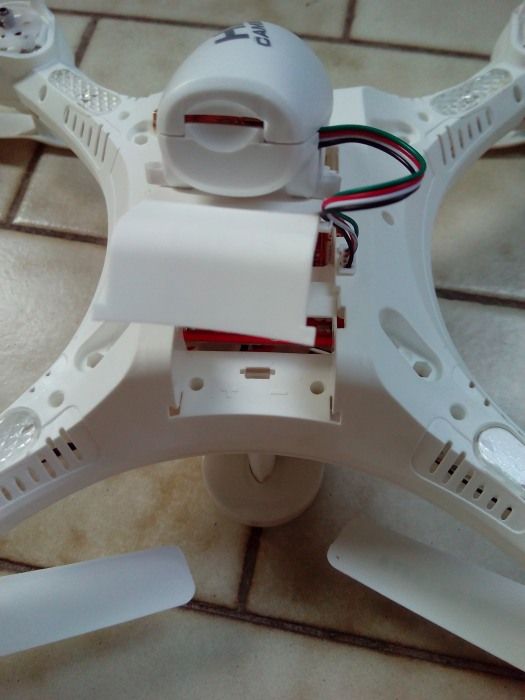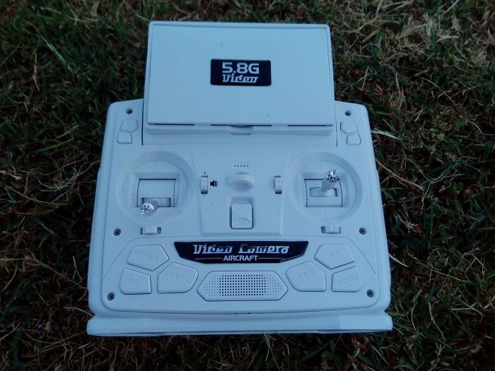 L’assemblaggio è davvero semplice, si inizia con incastrare i due carrelli negli appositi fori sotto al telaio e volendo è possibile montare le protezioni per le eliche. Si inseriscono 6 batterie stilo AA non incluse nel radiocomando e si richiude fissando il coperchietto con la vite dato che non offre molte garanzie di tenuta il solo incastro plastico. Sul lato destro della radio è possibile vedere un incavo dove è presente una scheda micrro SD per la registrazioni a terra di quanto ricevuto sulla frequenza dei 5,8Ghz. A tal propositi, è molto importante collegare la antenna a funghetto di fianco alla telecamera, pena la rottura del trasmettitore video una volta alimentato il circuito.
