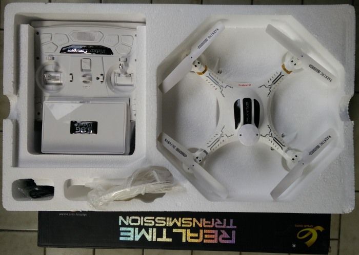 Il pacco del quadricottero è arrivato veramente in poco tempo e la confezione perfettamente integra si dimostra molto accattivante. Cade un pochino di stile appena aperta, in quanto la dotazione è abbastanza scarna, il manuale in inglese e cinese riporta poche informazioni, le eliche sostitutive sono solo due e non quattro come solitamente avviene. Manca il caricatore da muro, ma è presente un carichino con ingresso USB da collegare alla batteria a 2s da 850 mAh.
