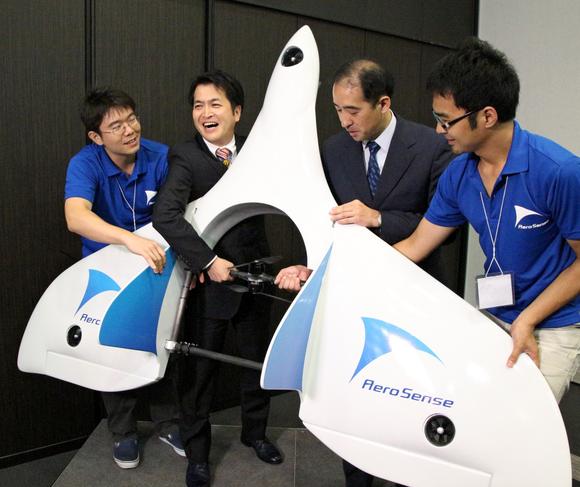 Tecnologia video, sensoristica e rete derivata dai cellulari Sony Xperia, tecnologia aeronautica della startup giapponese ZMP specializzata in robotica. Dal matrimonio tra telefonini e robot nasce la joint venture Aerosense, e il prodotto più interessante è AS-DT01-E un drone per la videosorveglianza che decolla verticalmente grazie a due rotori coassiali baricentrici che ruotano di 90 gradi per trasformarsi in eliche, aiutate nel volo verticale da tre ventole elettriche fisse annegate nello spessore delle ali e nel muso: un complesso sistema di sostentamento che permettere al drone di decollare e stare fermo in aria come un multicottero e volare un aeroplano convenzionale. Dal video si vede che la transizione tra volato e hovering pare semplice, basta frenare con una decisa cabrata, ma bisognerebbe capire se il merito è del software di gestione o del “manico” del pilota.