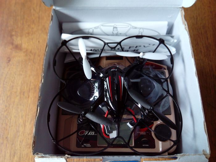 Come suggerisce il nome è dotato di trasmissione in FPV (First Person View – visione in prima persona) sulla frequenza analogica dei 5,8Ghz e le immagini possono essere ricevute sullo schermo LCD che incorpora un ricevitore video sulla stessa frequenza per visualizzare quello che inquadra la camera di bordo. Come se non bastasse, la video/fotocamera può registrare direttamente su una schedina micro SD i filmati o le foto a risoluzioni non eccelse, ma dai risultati sorprendenti se consideriamo le dimensioni e il peso dei componenti presenti. Il tutto ad un prezzo veramente esiguo, certo si tratta di un giocattolo, ma poco alla volta le prestazioni aumentano, e assomigliano sempre più a quelle dei droni di maggiori dimensioni e costi.