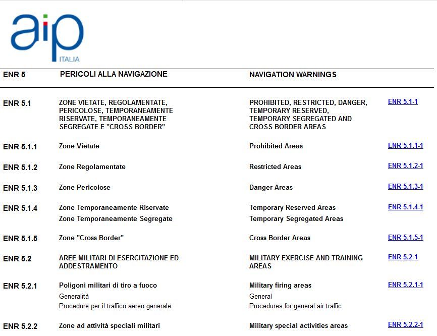 - AIP (Aeronautical Information Publication – la pubblicazione ufficiale contenente informazioni a carattere permanente e cambiamenti temporanei di lunga durata validi per l’attività aerea in generale nel territorio italiano)