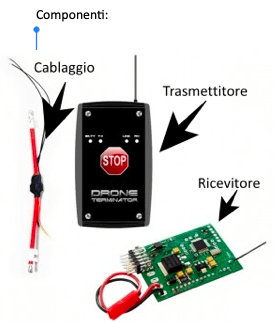 Tecnicamente il ricevitore a bordo (alimentato da una sua batteria indipendente) è cablato con un circuito “CUT OFF” composto da cavi elettrici e un mosfet installati tra la batteria e la powerboard del drone e una volta attivato, schiacciando il tasto STOP del trasmettitore a terra, interrompe immediatamente l’alimentazione del drone fermando immediatamente i motori. È interessante notare che l’operazione è reversibile e cioè ridando l’impulso da terra il sistema si rialimenta, ma ovviamente questo non significa che il drone possa ritornare a volare come prima poiché in quei pochi secondi senza alimentazione l’assetto, la quota e tutto il resto possono essere ormai compromessi in maniera irreversibile e irrecuperabile. Quindi occorre essere sicuri prima di attivare il terminatore perché poi riprenderlo è praticamente impossibile.