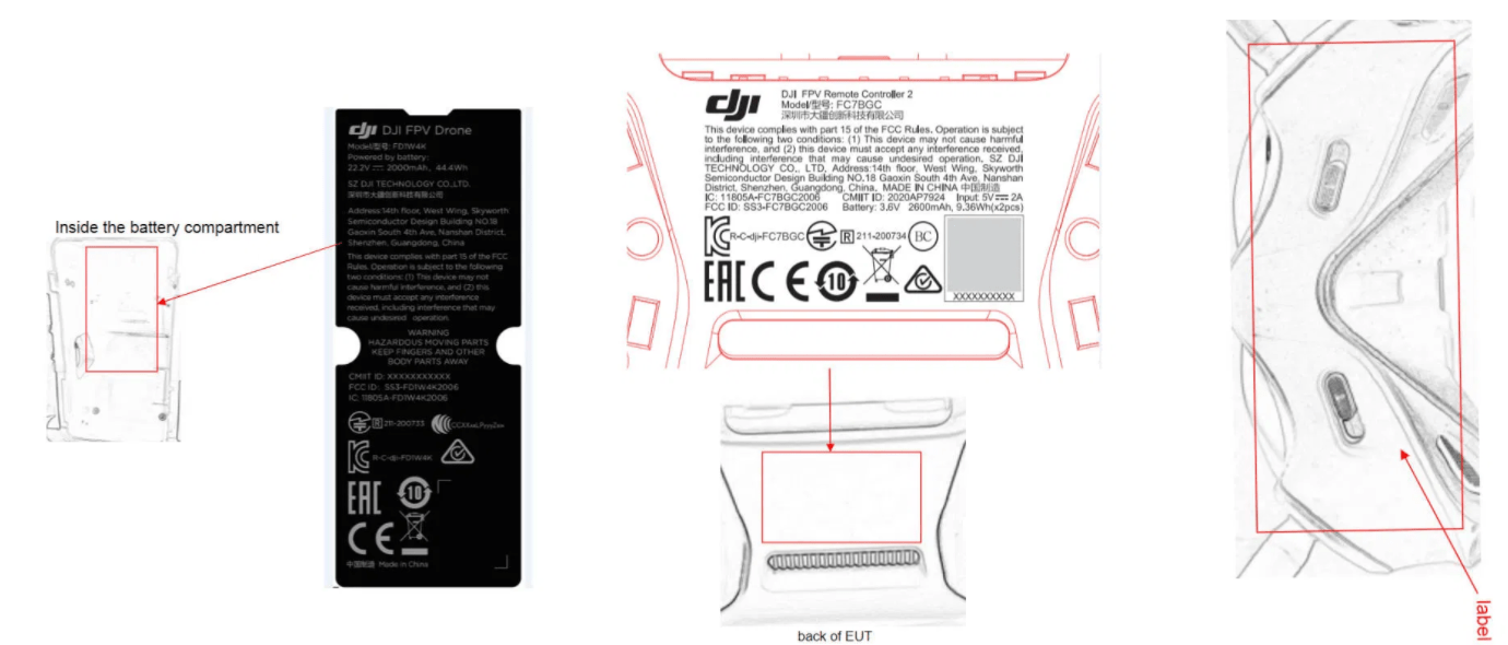Da quel che DJI ha comunicato a FAA, l’ENAC americana, si nota che il modello del drone è FD1W4K, verosimilmente con camera 4K, e ha una batteria da 2000 mAh a 22,2 V. L’etichetta si trova anche all’interno del vano batteria, suggerendo che la batteria è bloccata nel suo comparto durante un volo. dall’etichetta del controller invece impariamo che la batteria è da 2600 mAh a 3,6 V e il modello è FC7BGC. Si nota che il radiocomando ha un foro di ventilazione appena sotto l’etichetta e  impugnature gommate su entrambi i lati. Appena sopra, c’è un connettore che sembra il supporto per la grande antenna già vista nei leak.