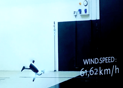 la coppia, che come abbiamo detto è impressionante, consente al piccolo Parrot di affrontare sia l’aria rarefatta delle alte quote (è stato testato addirittura sulla vetta del Monte Bianco) e soprattutto di fronteggiare venti che sembrano uragani: impressionante la sequenza nella galleria del vento, dove il parrot è andato in crisi solo quando il tornado ha superato i 65 km/h. Ottimo test da fare in laboratorio, ma sconsigliamo vivamente di volre quando ci sono raffiche del genere.