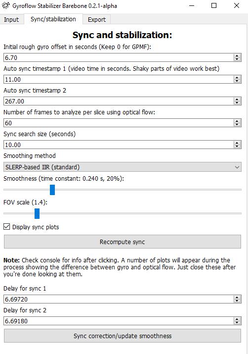 Poi scegliete due punti dei video nei quali volate livellati e vedete un po’ di vibrazioni di roll e pitch. Impostate la fov relativa al preset cam che avete caricato e premete “apply settings and compute sync”.