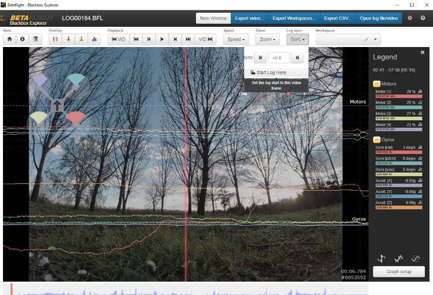 Per prima cosa è necessario aprire il file Blackbox di Betaflight con Betaflight Blackbox Explorer (https://github.com/betaflight/blackbox-log-viewer/releases) programma che permette di visualizzare i dati di assetto del vostro mezzo ed esportarli in formato CSV (necessario per GyroFlow).