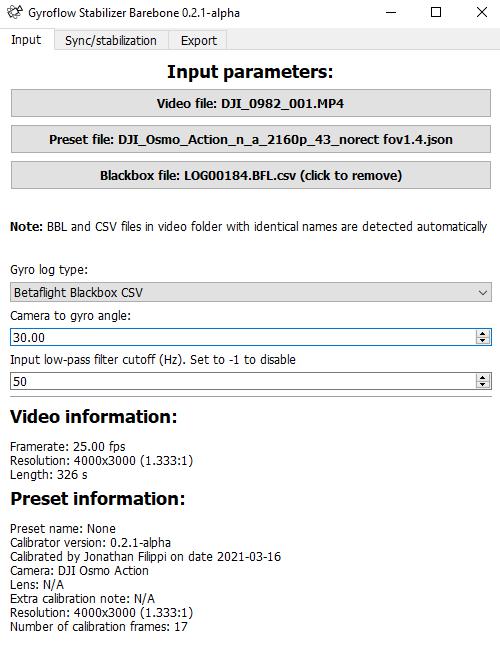 Per ora è in versione alpha, che è quella che ho testato personalmente. Tale software si avvale dei dati inerziali della FC registrati da Betaflight per stabilizzare le riprese e comprende i seguenti moduli: