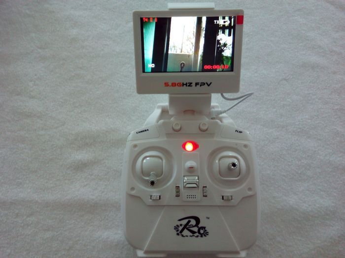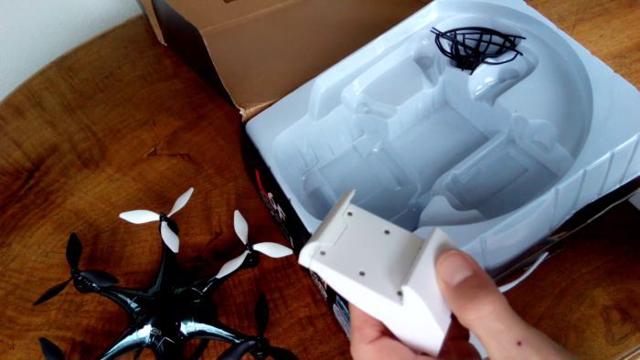 Aprendo la scatola abbiamo trovato un monitor per il First Person View sintonizzato sulla banda dei 5,8Ghz, ma onestamente non sapevamo come attaccarlo alla radio. Aprendo del tutto la confezione e girando l’imballo in plastica termo-formata, abbiamo trovato attaccati sul retro, un piccolo set di eliche di ricambio, un cacciavite per la piccola manutenzione e un supporto in plastica bianca per incastrare il display LCD da 4 pollici sulla parte alta del radiocomando.