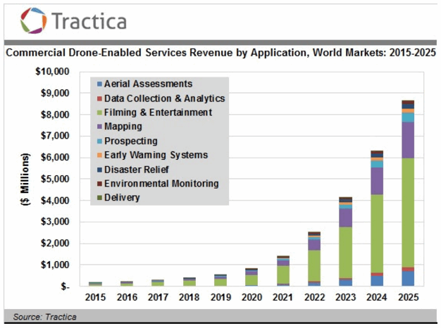 2016-05-02-07_32_40-Commercial-Drone-Enabled-Services-Revenue-Will-Reach-8.7-Billion-Annually-by-20Oggi il valore a livello mondiale dei servizi professionali, dalla fotografia alla telemetria all’agricoltura è poca cosa, appena 170 milioni di dollari all’anno, tanto quanto un magnate cinese ha sborsato per comperarsi un quadro di Modigliani. Ma il mercato, assicurano gli analisti di Tractica, è appena agli inizi, e con una cavalcata impressionante pare destinato a raggiungere gli 8,7 miliardi di dollari nel 2025, più o meno quanto vale la Ferrari. Intesa come azienda, Marchionne compreso, non come singola auto.