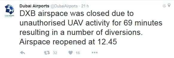 Sabato 11 giugno verso le 10 ora italiana, un volo non autorizzato di un drone, ha costretto la torre di controllo a dirottare i voli in arrivo verso altri aerodromi vicini e bloccare le partenze per 69 minuti, a causa di un volo non autorizzate di uno UAV, come viene definito nel tweet proveniente dall’account ufficiale del Dubai Airports.