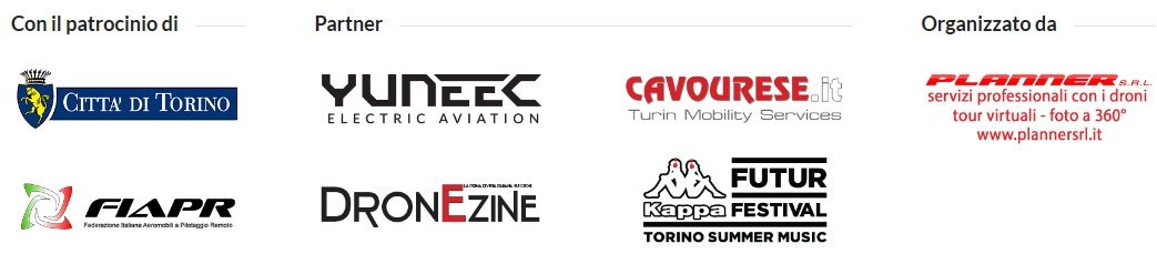 Hanno dato il loro patrocinio La città di Torino e l’associazione FIAPR e tra i partner si leggono i nomi di Yuneec Aviation, la rivista Dronezine, Kappa Future Festival e Cavourese, Il tutto organizzato da Planner srl..