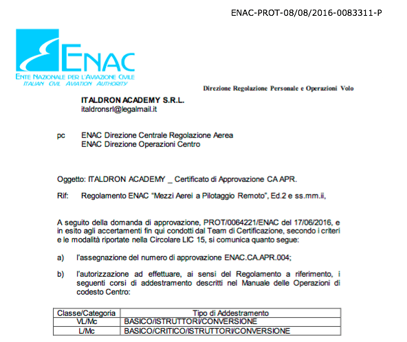 La prima scuola italiana per piloti professionisti di droni a partire con le nuove regole, che prevedono corso teorico e pratico insieme, è la ravvennate Italdron. Il corso è rivolto ai piloti che necessitano di essere formati nel rispetto della seconda edizione del regolamento ENAC. Le categorie coinvolte nel primo modulo saranno: VL NON CRITICO per MULTIROTORI con peso minore di 4kg e L NON CRITICO per multirotori con peso uguale o superiore ai 4kg.