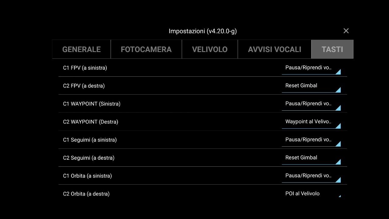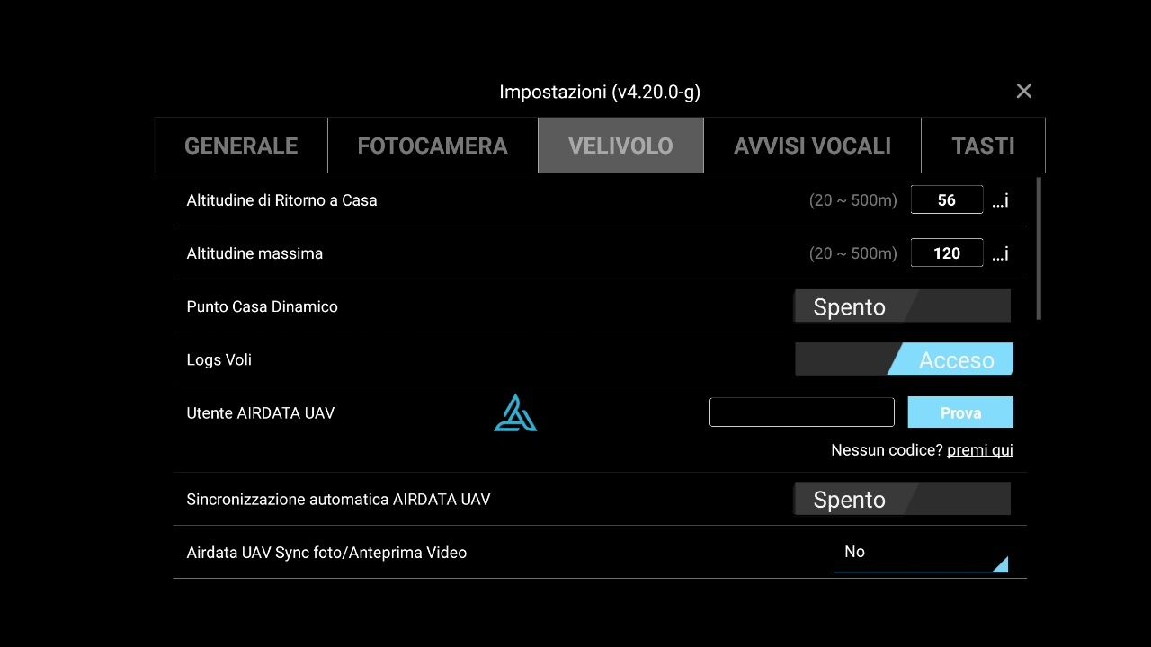 Addirittura abbiamo la scelta di abbinare differenti configurazioni per i tasti funzione per ogni tipo di modalità di volo. Simpatica anche la possibilità di inviare i log di volo al servizio Airdata, per una analisi di eventuali problematiche o un semplice registro di tutti i voli realizzati.