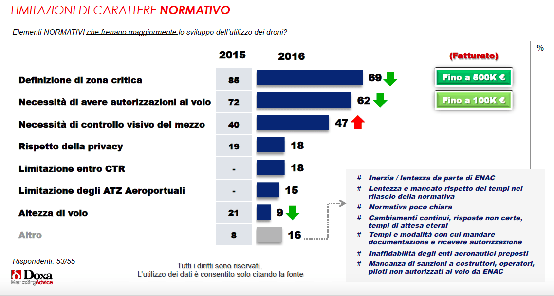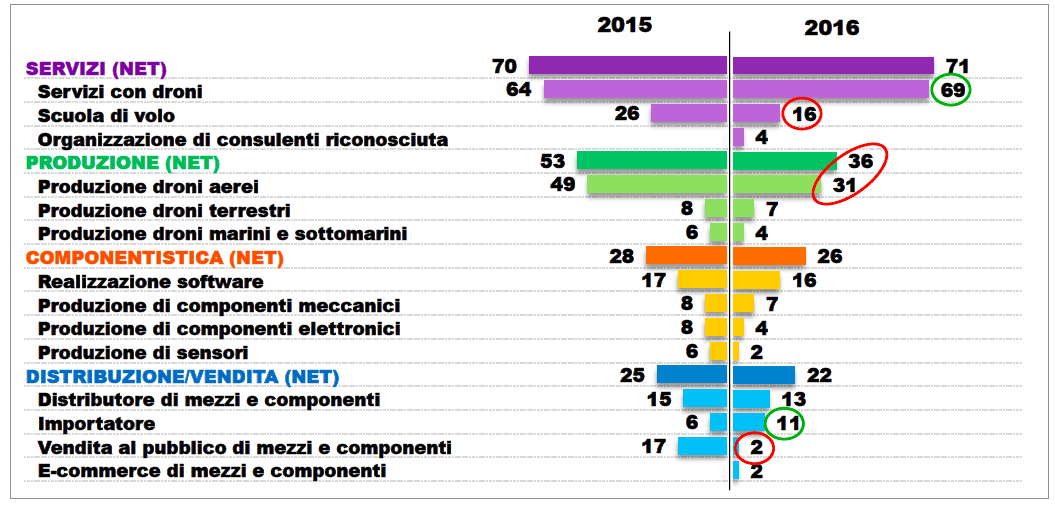 E soprattutto le aziende fatturano più del previsto. Cambia il modello di business, si investe meno in produzione e ricerca e di più in pubblicità e comunicazione. Crescono i servizi, cala la produzione di droni. Si intensificano i rapporti con le Università e lo Stato, e si comincia a fare la pace con ENAC, anche se il regolamento è sempre visto come un potente freno allo sviluppo. Nel suo complesso il comparto si conferma attrattivo e vitale.