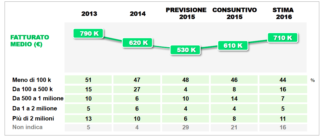 Continuano infatti a nascere nuove società (+10% rispetto al 2015), con un fatturato medio delle aziende superiore alle previsioni. Per l’anno in corso si stima una crescita ulteriore, che potrebbe portare la dimensione del business molto vicina ai livelli record di 3 anni fa, con positive ricadute anche dal punto di vista occupazionale. Su questo aspetto vale la pena di segnalare che nel 2016 il numero medio di addetti per azienda potrebbe crescere di 2 unità a confronto con quanto previsto lo scorso anno.
