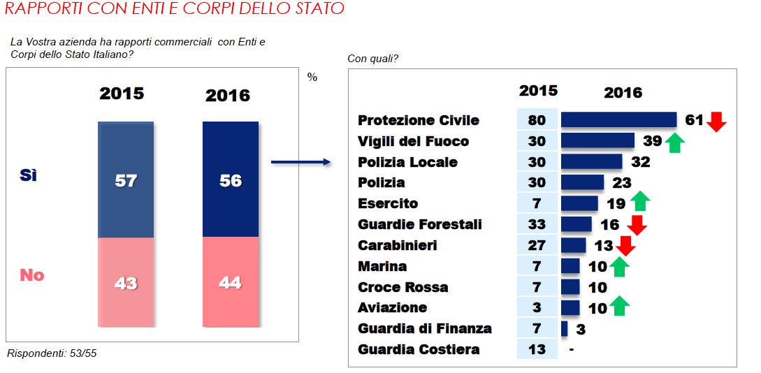 I rapporti tra l’industria dei droni e le istituzioni permangono frequenti: mediamente 1 azienda su 2 dichiara di intrattenere relazioni con il mondo accademico e/o con enti dello Stato. Ne deriva la crescente convinzione che il settore di impiego dei droni con maggiori potenzialità sia quello pubblico: il 47% del campione si esprime in questo senso, contro il 40% rilevato lo scorso anno. Si registra in particolare un’intensificazione dei rapporti commerciali con Esercito, Marina e Aviazione, mentre risultano in calo quelli con Protezione Civile e corpi dedicati all’ordine pubblico (Polizia e Carabinieri).
