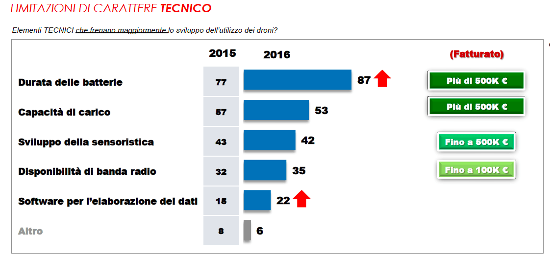 Per quanto concerne le limitazioni di carattere normativo, la definizione di zona critica e le autorizzazioni di volo sono ancora i topics più rilevanti per gli operatori, sebbene sia diminuita in modo sensibile la quota di aziende che segnalano tali criticità. Aumentano invece le osservazioni riguardanti il controllo visivo dei mezzi. Dal punto di vista tecnico, si conferma il focus primario sulla durata delle batterie, ma sono anche molto richiesti dagli opratori sensori più potenti e precisi.