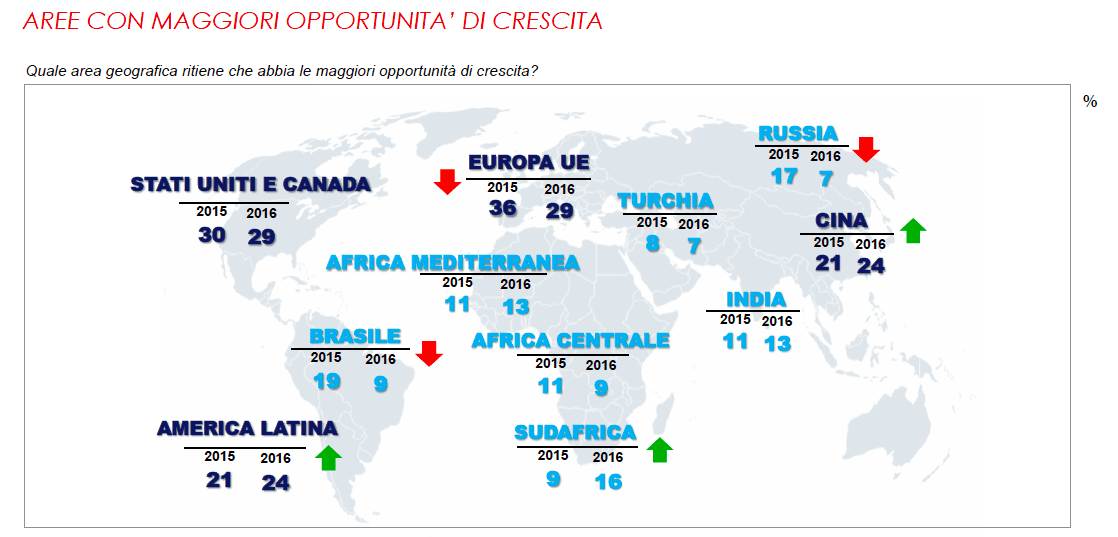 I mercati internazionali a cui si attribuiscono maggiori opportunità di sviluppo del business sono ancora Stati Uniti e Canada, con previsioni più positive che in passato per Cina, Sudafrica e America Latina. Meno ottimistiche sono le valutazioni per Europa, Russia e Brasile, che segnalano un trend negativo. Si conferma in ogni caso un settore caratterizzato dalla prevalente presenza di piccole imprese: oltre metà hanno un fatturato inferiore ai 500mila Euro e meno di 5 addetti, soprattutto nell’ambito dei servizi.