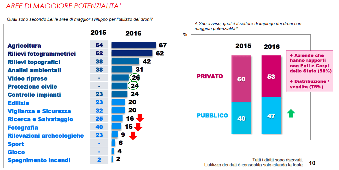 Anche in Italia, come nel resto del mondo, l’agricoltura è il settore che dà più soddisfazioni, seguito dalla fotogrammetria e rlievo topogradico. Le videoriprese sono solo al quinto posto tra i settori ritenuti più dinamici dagli addetti ai lavori. E rispetto allo scorso anno, sono molti di più gli operatori che credono che i droni servano soprattutto al settore pubblico: ora sono quasi la metò, lo scorso anno erano il 40%.