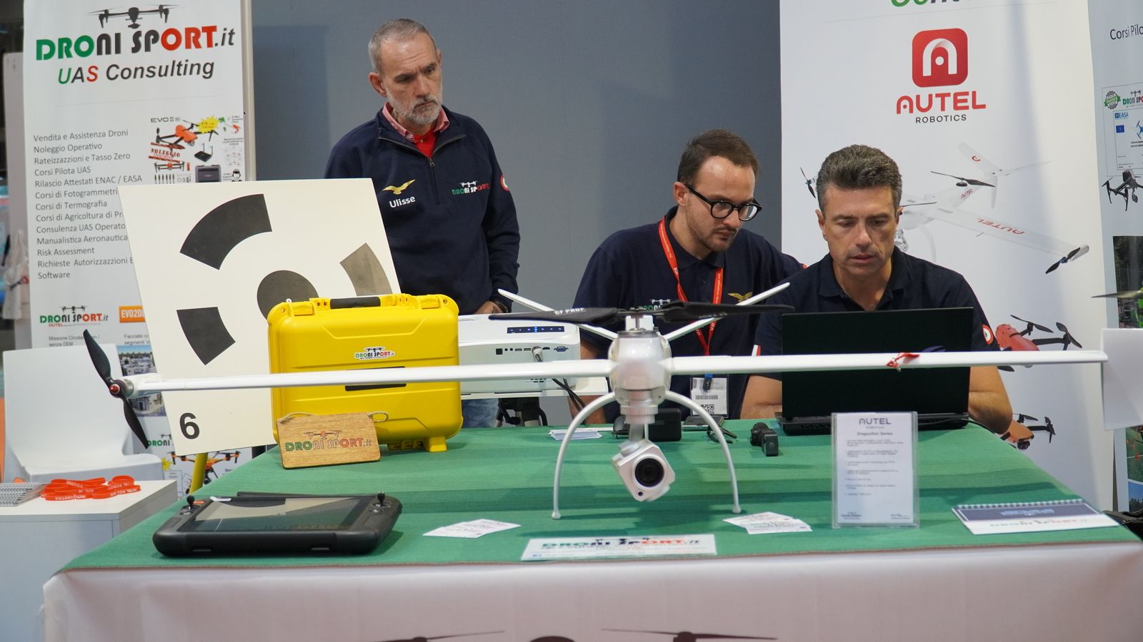 Subito a fianco notiamo lo stand di Dronisport, con Antonio Zenzola, formatore, istruttore e ceo della azienda che da anni, distribuisce droni di Yuneec, DJI e Autel.