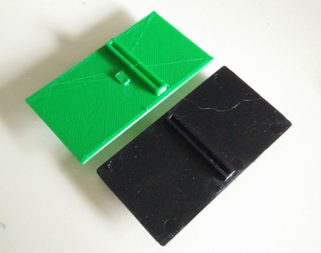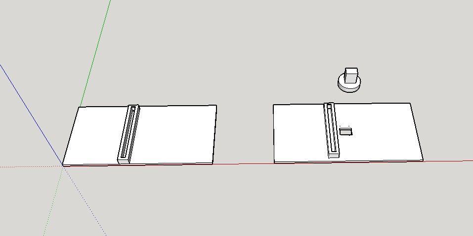 Possedendo una stampante 3D ci è sembrato ovvio procedere con una semplice modifica alla suddetta slitta. Disegnato il piccolo particolare con Sketchup, programma gratuito per la modellazione 3D, si è proceduto a farne 2 versioni, una con il pomolo per un facile aggancio e spostamento con le dita e uno senza per consentire una veloce stampa senza problemi.