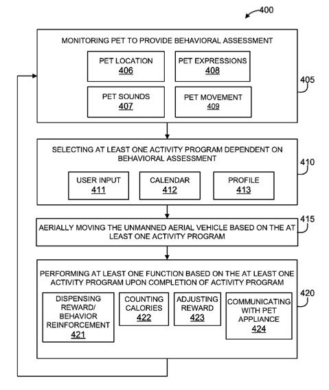Il drone è corredato di sensori di vario tipo, non manca nemmeno un termometro per sapere se l’animale può avere troppo freddo o troppo caldo, e un microfono per scoprire se miagola, abbaia, ringhia o fa le fusa. E anche una telecamera per seguirlo e vedere se sta entrando in zone della casa che per lui sono off limits. La camera nelle intenzioni dei veterinari, pardon degli ingegneri IBM riconosce anche i pattern di attività della bestia, quindi se si stufa può intrattenerlo con dei giocattoli controllati via Internet. Sempre secondo quel che si legge nel brevetto, durante il gioco il drone lo incoraggia con frasi preregistrate con la voce del padrone che lo coccola e lo incita. E lo può anche sgridare, se non a il bravo o la brava.