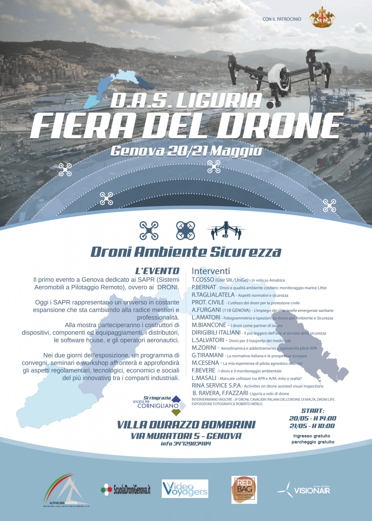 Il 20 e 21 maggio presso villa Bombrini di Genova Cornigliano via Lodovico Muratori 5, si terrà la prima edizione del D.A.S: Droni Ambiente Sicurezza, il primo evento a genovese dedicato ai Droni, ovvero ai SAPR (Sistemi Aeromobili a Pilotaggio Remoto).