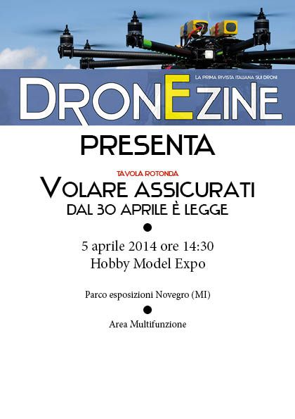 Locandina AssicurazioniSabato 5 aprile ore 14:30 Volare Assicurati le assicurazioni per chi vola con i droni, sia per lavoro sia per divertimento. Partecipano Adolfo Peracchi (FIAM) e gli assicuratori italiani che hanno polizze per droni professionali.