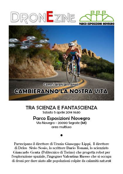 Locandina FantascienzaSabato 5 aprile ore 16:30 Come i droni personali cambieranno la nostra vita, tra scienza e fantascienza. partecipano il direttore di Urania Giuseppe Lippi, ll direttore di Delos Silvio Sosio, lo scrittore Dario Tonani, lo scienziato Giuseppe Genta (Politecnico di Torino) che progetta robot per l’esplorazione spaziale, l’ingegner Valentina Russo che sviluppa droni per il soccorso alle popolazioni colpite da calamità naturali.