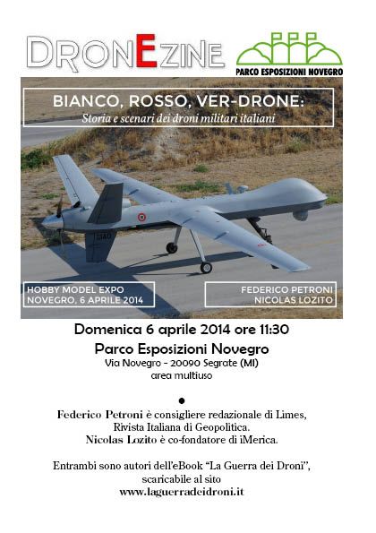 Locandina IMERICADomenica 6 aprile 11:30: Bianco, rosso e verDRONE, i droni militari italiani, organizzato in collaborazione con il collettivo iMerica: