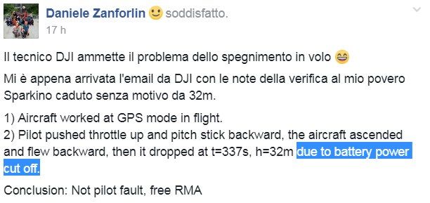 La cosa viene confermata anche da Daniele Zanforlin, un utente del gruppo facebook DJI SPark Italia, che a seguito della spedizione a DJI del suo drone Spark caduto senza apparente spiegazione, riceve come risposta più o meno: “Il pilota stava effettuando alcuni manovre durante le quali è caduto da 32 metri a causa di un taglio di erogazione di corrente della batterie. Conclusione: nessuna colpa per il pilota; reso gratuito in garanzia.”