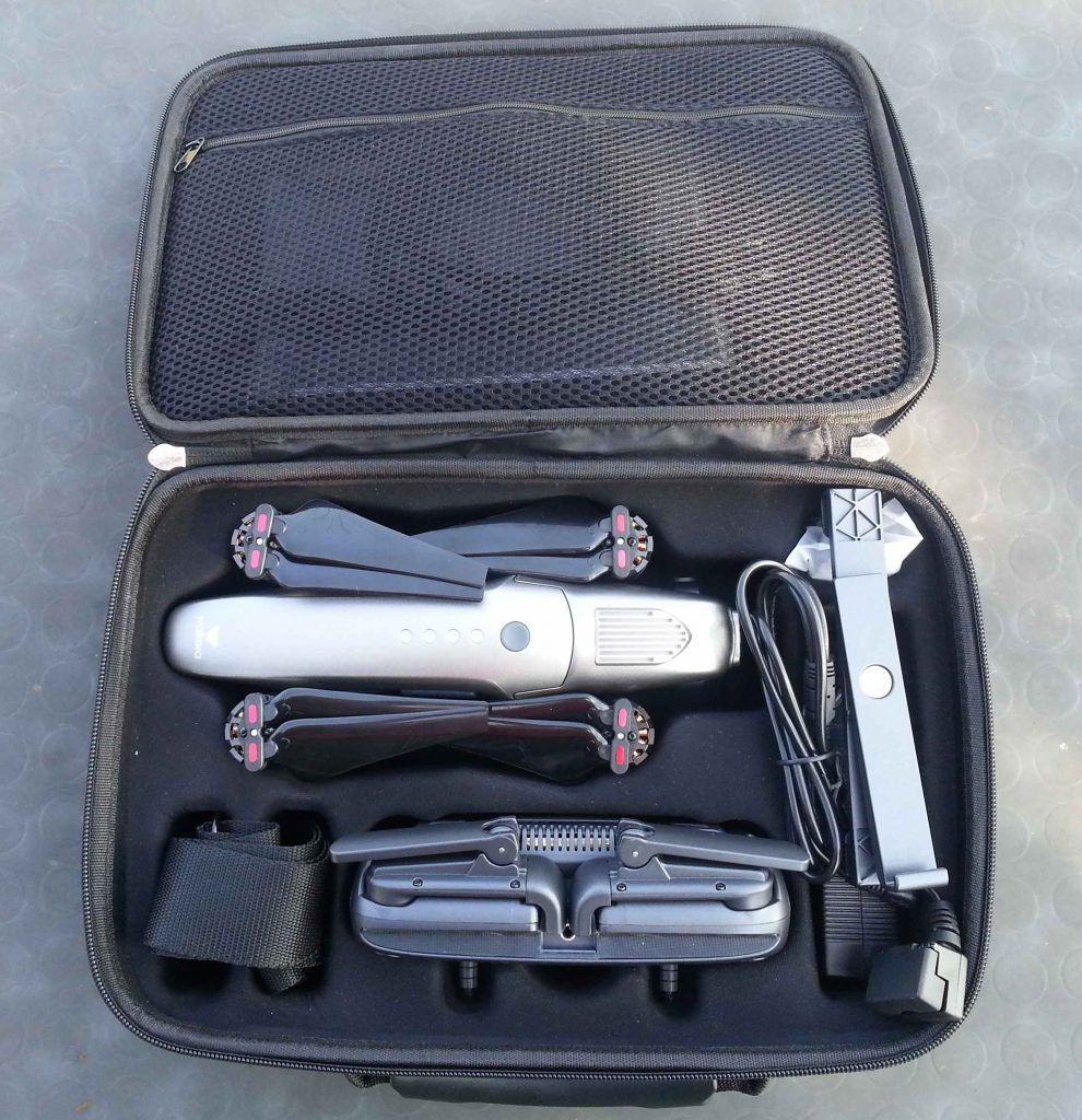 Esteticamente piacevole da vedere, tondeggiante senza spigoli accentuati. Anche lui pieghevole. Nella parte superiore, una volta aperta, si può incastrare uno smarpthone o grazie ai supportini compresi nella confezione, anche un tablet di generose dimensioni. La trasmissione e ricezione dei segnali del radiocomando, e la ricezione delle telemetria e del segnale video non vengono compromessi in quanto le antenne sono al di fuori della massa del telefono e rivolte verso il basso.