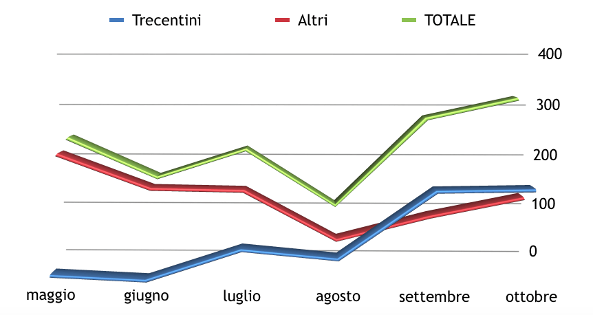 Negli ultimi sei mesi, abbiamo assistito al sorpasso dei trecentini sui droni non inoffensivi: la storica svolta è avvenuta a Settembre, e non accenna a scendere. I dati in percentuale (immagine sopra, in blu i trecentini, in rosso gli altri SAPR) possono nascondere un fatto statistico interessante: l’apparente leggera flessione dei droni inoffensivi tra settembre e ottobre non è dovuta a un calo delle dichiarazioni presentate dai trecentisti, che è sostanzialmente invariata, anzi, i trecentini sono addirittura cresciuti (172 a settembre,  174 a ottobre) quanto al rapido recupero dei droni non inoffensivi, che hanno messo a segno un settembre magico, dopo la pausa forzata di Agosto, che ha interessato tutte le macchine e ovviamente dipende dalle ferie: