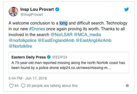Solo domenica all’alba il drone della polizia l’ha individuato, vivo, un un fitto canneto costiero. L’uomo è stato quindi portato un salvo con un elicottero e trasferito all’ospedale più vicino: non sono state rese note le sue condizioni di salute. Lou Provart, capo tecnologo della polizia di Norfolk, ha dichiarato in un tweet che “E’ una felice conclusione di una ricerca molto complessa e difficile. la tecnologia dei nostri nuovi droni una volta di più ha confermato la sua utilità”.