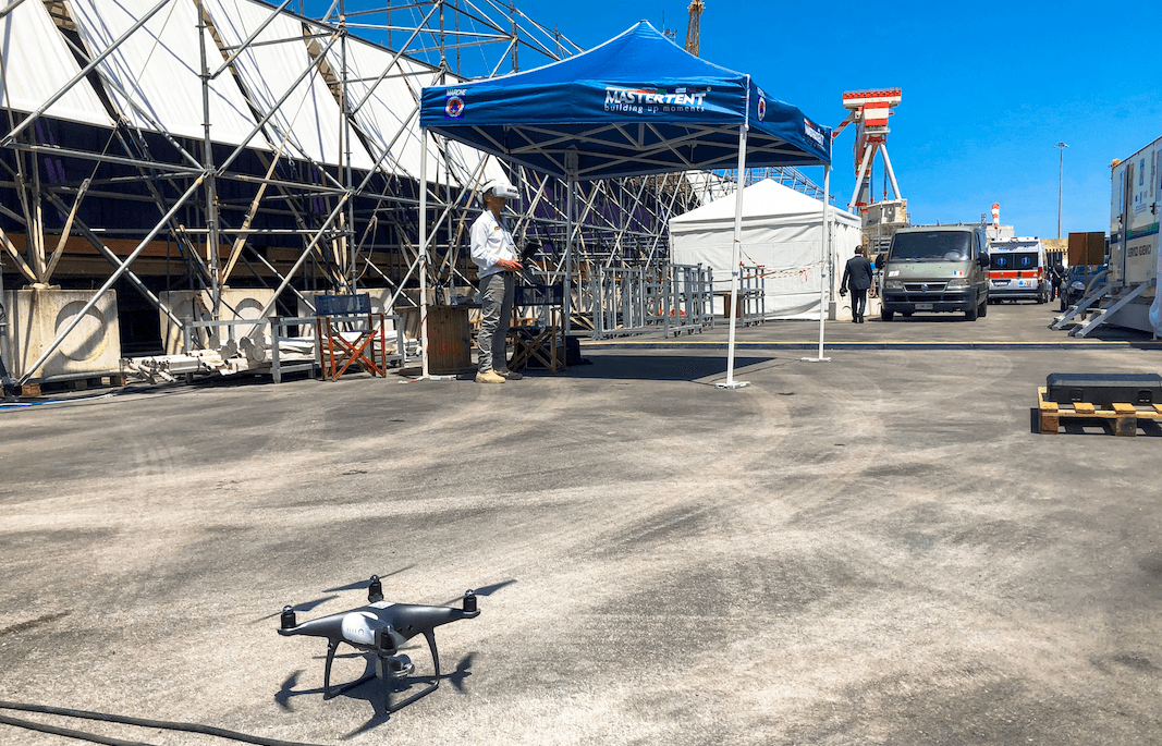 Rimaneva confrontarsi con la presenza di eventuali sistemi di disturbo “antidrone” possibili vista la situazione. È bastato coordinarsi con chi si occupava della security a terra e conoscere intensità e raggio di eventuali dispositivi accesi. Una prova generale è stata effettuata il giorno prima dell’evento con i reparti e gli equipaggi delle navi schierati, senza la presenza del pubblico, in maniera da testare i tempi di cambio delle batterie per permettere di coprire le due ore di evento, le interferenze, il grande caldo e non ultimo… lo stress del pilota.