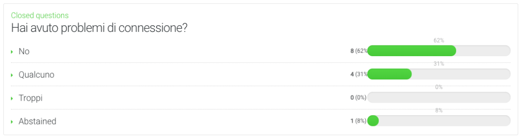 Problemi risolti dunque, e così tutti, ma proprio tutti, hanno potuto seguire i lavori senza problemi. Per la cronaca, il 71% dei partecipanti ha seguito i lavori con uncomputer, il 29% con uno smartphone Apple, curiosamente a questo giro nessuno si è collegato con un tablet o un telefonino Android.