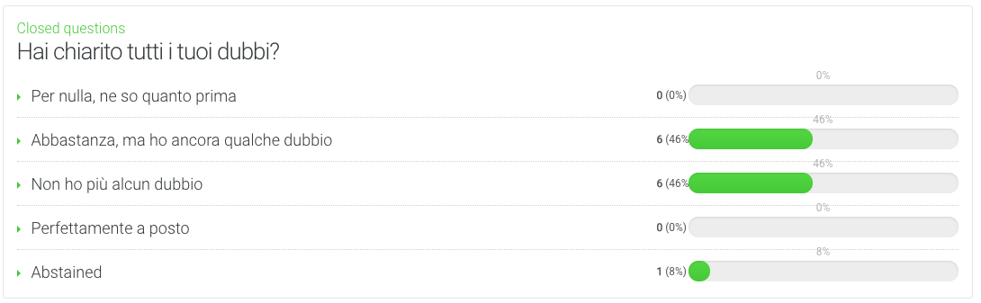 Certo, il vero plebiscito che vede il webinar prevalere sull’insegnamento in aula va letto anche alla luce del fatto che il sondaggio è stato fatto su persone che si erano iscritte proprio a un webinar, ma non è che sia stata una scelta sempre libera: alcuni dei partecipanti si erano iscritti a corsi in aula, ma poi hanno deciso di rinunciare e unirsi al webinar per diversi motivi: o perché il corso in aula non si è potuto tenere (come nel caso di Milano, che è stato rinviato all’ultimo momento) o perché impegni personali hanno impedito loro di partecipare ai corsi in aula.