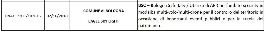 L’approvazione ufficiale della autorithy aeronautica con protocollo ENAC 107615, è arrivata il 2 ottobre 2018 e recita: “BSC Bologna Safe City/Utilizzo di APR nell’ambito security in modalità multi-volo/multi-drone per il controllo del territorio in occasione di importanti eventi pubblici e per la tutela del patrimonio”.