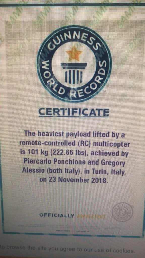 Mancava giusto la ciliegina sulla torta, e cioè l’ufficializzazione da parte del Guinness dei primati, e oggi è arrivata. Complimenti quindi a Ponchione e Alessio, i due progettisti-costruttori del Forvola, il drone dei record, che ha sollevato 101 kg per 1’03” stracciando il precedente record di Oslo ( in quell’occasione erano stati sollevati 61 kg per 30 secondi). Un record che ci rende fieri e che sentiamo anche un poco nostro, visto che uno dei giudici del record stabilito a Settimo Torinese il 23 novembre scorso era il nostro direttore scientifico, Stefano Orsi. Ne parliamo con Gregory Alessio, neo campione del mondo di sollevamento pesi con droni radiocomandati.