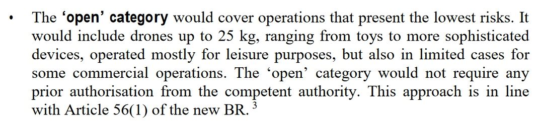Open Category – Categoria ‘aperta’ destinata alle operazioni con il rischio più basso. Essa include i droni sino a 25kg, partendo dai giocattoli e arrivando sino a dispositivi più sofisticati. droni che possano compiere attività amatoriali, ma in alcuni limitati casi, anche per utilizzi professionali. La categoria Open non richiede preventive autorizzazioni dalle competenti autorità.