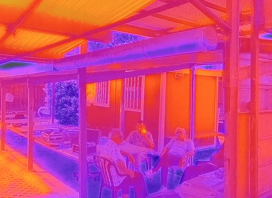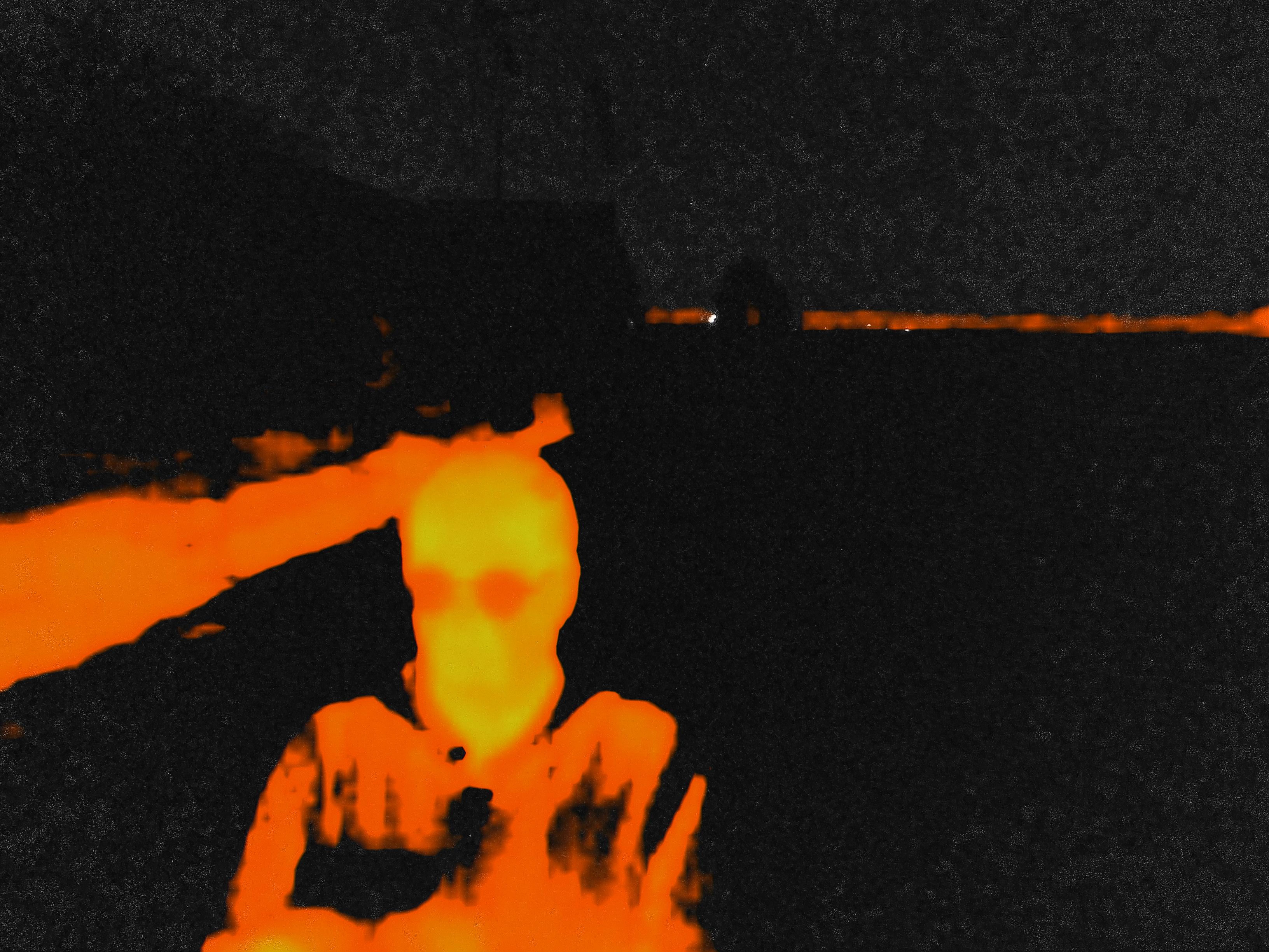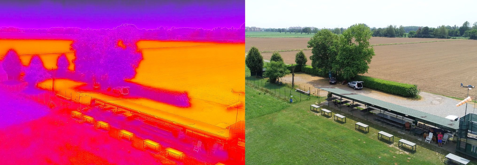 In tutte queste riprese il drone ha usato solo i dati termici, visto che in mancanza di luce non può avvalersi della camera ottica, che ovviamente al buio non funziona (vedi la prima immagine di questa serie). Se invece c’è luce i due canali vengono mischiati rendendo la scena molto più facile da leggere, come vediamo dall’immagine qui sotto.